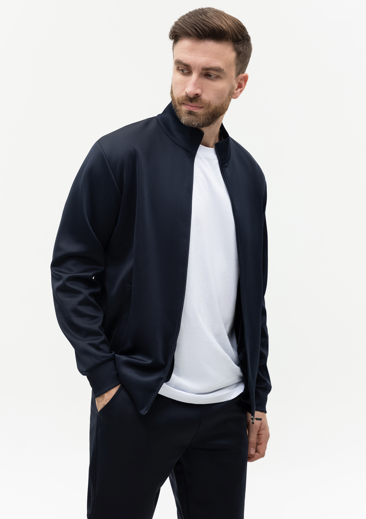 Мужская олимпийка прямого силуэта с воротником-стойкой, втачным рукавом, прорезным карманом и застежкой на молнию. Манжет и пояс изделия оформлены широкой эластичной резинкой для дополнительной защиты от ветра и сохранения тепла.