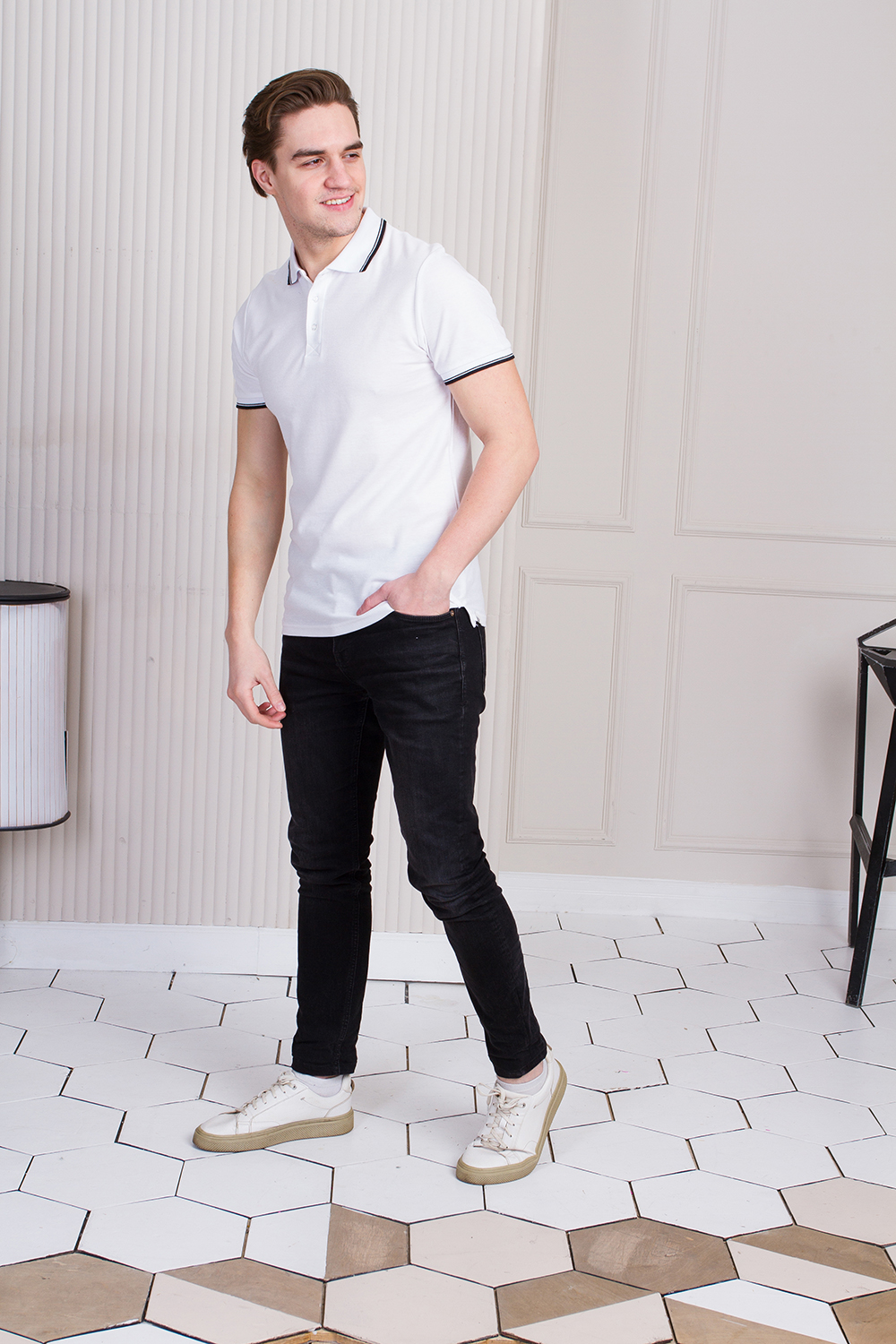 Мужское поло прямого силуэта с отложным воротником, втачным коротким рукавом и застежкой на пуговицы. Воротник и манжет оформлены контрастной тесьмой. <br />